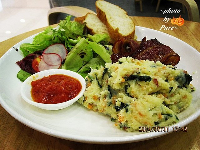购买的他们家的培根水手土豆泥。这家店开在中信泰富,离我非常近,心想就p484过去试试看咯在5楼costa的旁边。看起来明亮而整洁,比costa的人气旺多了。布局也和costa有点相似。