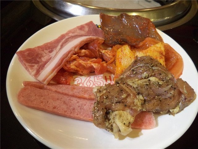 牛板筋,鸡柳,烤肠,猪仔骨,有个挺大的黑胡椒味道的肉排,鱿鱼,都很好吃,