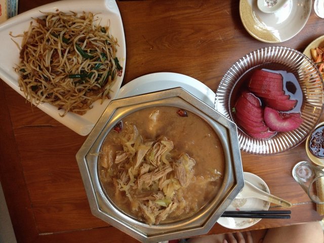 同学聚餐于是选在了他们家店,据说菜码大适合聚餐,果然没有让我们失望,点的菜名不记得总之有排骨,狮子头,还有类似酸菜粉条的东北特色菜,还有个好像叫什么雪衣豆沙的女士甜品菜,最有特色的我觉得最特别是他们家的狮子头,是那种2个起卖的,而且装的盘子也很有趣,是2个连体盘子,每个装一个丸子,而且丸子里面有一个鸭蛋黄,吃到最后居然有惊喜心情难以言表啦!还有一个类似火爆大头菜,菜码特别大。而且味道也不错!点了个牛肉柿子汤,不过感觉那个番茄是那种勾兑的不是新鲜柿子,不是很喜欢!价格也都是普通的菜价,相对于分量来说真的是很划算的!