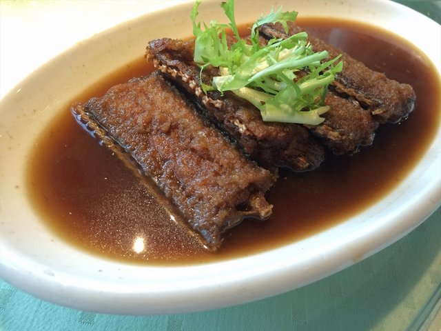 【古法烧带鱼】42元。卖相无精打采,味道却依旧可圈可点。带鱼厚实,肉多刺少,鱼肉并没有因为炸制定型而丧失水分,相反,还吸足了鲜美的汤汁,不会因为肉厚而寡味。霍先生的菜,不爱吃鱼的我倒也觉得不赖