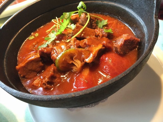 【番茄牛腩】78元。非常好吃!汤汁怎么就能掌握得如此精准?时间稍短则汤汁稀松,包裹不住块块牛腩;时间稍长则过于浓稠,加上纯纯儿番茄细沙的幸福口感,不成了番茄酱才怪~这绝妙的汤汁还不算完,块块牛腩带筋带肥,软烂的程度让你觉察不出肉质的存在,一口咬下去,酸甜的番茄汤汁爆浆而出,好不痛快!里面的颗颗番茄,既不是大块的西红柿,也不是小颗的圣女果,而是大小居中、成本较高的mini西红柿,因为是整颗,又去了皮,所以也是照例爆浆的节奏哈
