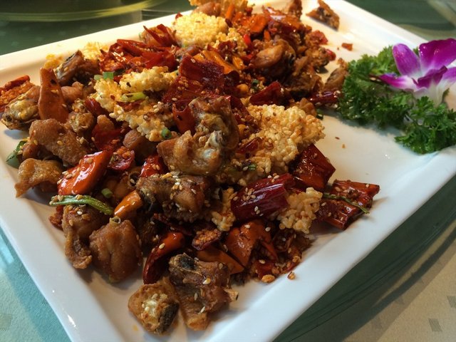 【椒盐鸭架】15元。鸭架,我是向来主张煲汤食用的。椒盐的做法,一来油上加油,非常不健康,二来口感干柴,实属下下品。当天因为没人愿意把鸭架带回家,再加上霍先生其实好这口儿,满足回他的口儿,椒盐的做法,准了~结果……好吃得跳舞转圈圈呀!!!淡定不下去了!!!我一直以来鄙视的椒盐鸭架呀!!!怎么能做的这么好吃!!!特别特的酥脆,裹了薄薄的一层面糊么?而且,居然一丁丁都不油,绝对把烤鸭原有自带的油脂都逼出去了不少!而且那个味道呀~绝了!绝不是简单的撒把椒盐,绝对独家秘制的辛香料!艾玛,现在以描述起来又激动了……