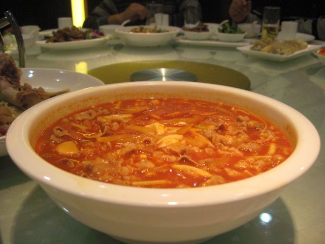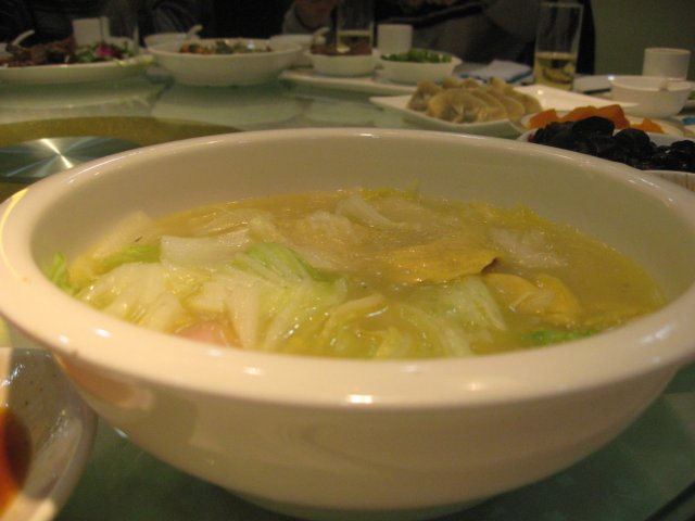 三鲜汤,里头有蛋饺,粉丝,白菜等,很家常的一道菜,不过吃起来暖暖的。