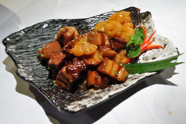 版纳火烧肉:外皮带酥,肉嫩而多汁,蘸着酸辣的酱汁吃很有滋味而不油腻。