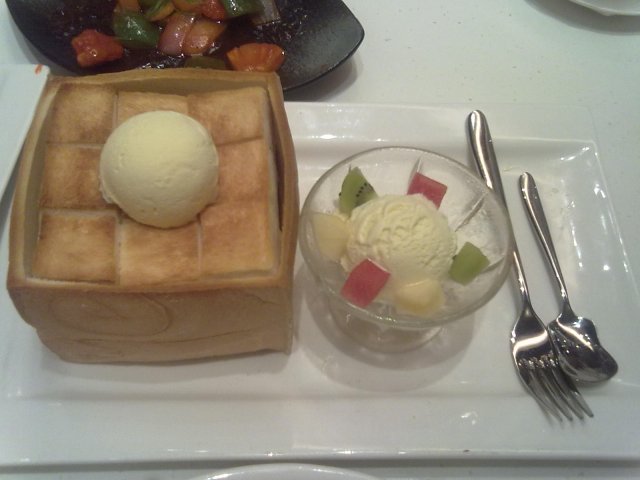 吐司冰淇淋大赞!改天一定要自己要一个慢慢吃了去,吐司软软的带些劲道,冰淇淋也好吃,配在一起真是绝啊