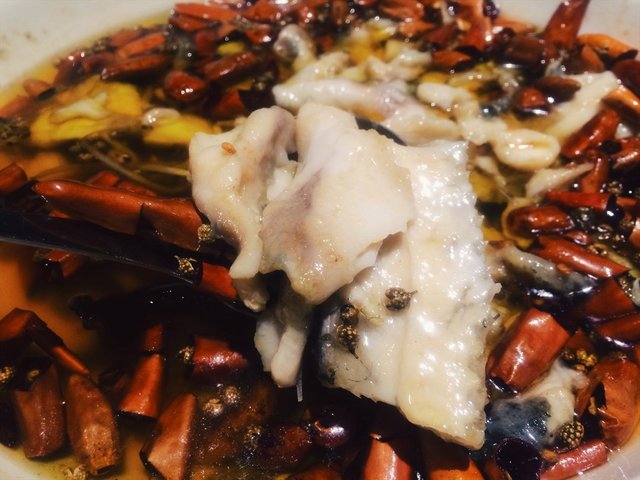 水煮鱼,48米。按份点的水煮鱼会比较实在一点,鱼应该用的是草鱼,有小鱼刺的说,亲们吃时小心。鱼肉嫩嫩哒,配菜豆芽也很入味,辣度不大,吃起来刚刚好。服务生看我们一直在拍照没好意思马上就把辣椒捞走,很贴心。
