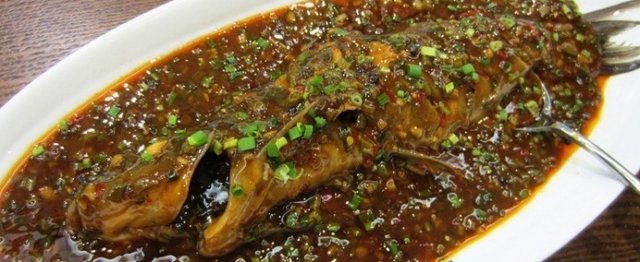 名字取得真复杂。就是一条蒸的黔鱼上面浇了用泡豇豆泡海椒做得酱料。