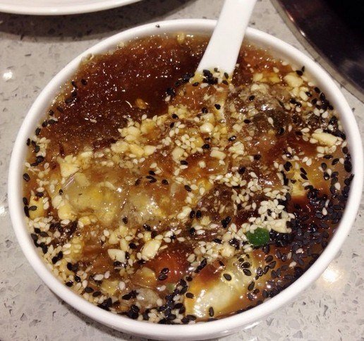 吃一口麻辣,受不了的时候赶紧来一口冰粉,火焰山就完全下去,就像烈日炎炎下的一跟冰棍啊,芝麻花生超多,一口下去再来一口,根本停不下来,而且每碗分量都很足,大家吃过何师烧烤的冰粉吗?真的是他家冰粉5碗倒在一起的分量~我们两个人要了4碗,我统统吃完了。。