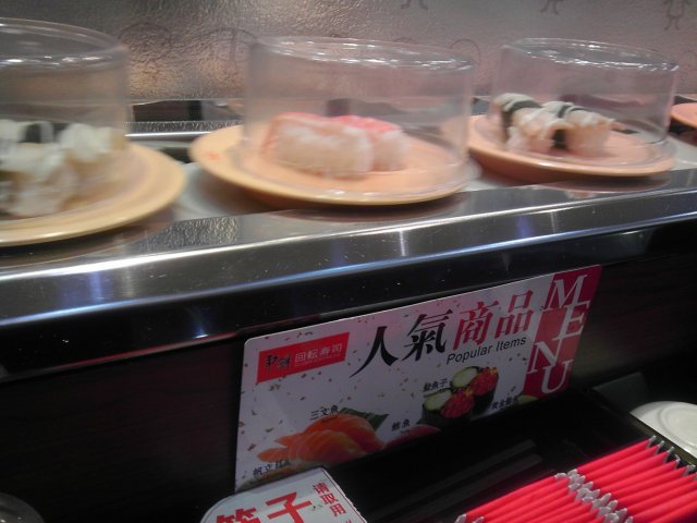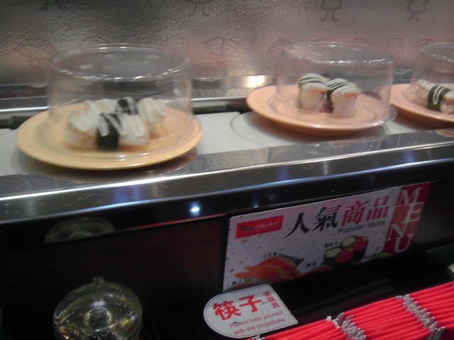 最后又无意中看到一个最漂亮的三文鱼寿司转了过来,比他家门口招牌上那个好看