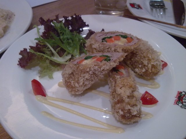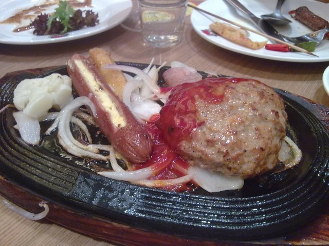 @ 牛肉汉堡配芝士香肠,这道菜据老板介绍是日本人比较喜欢的,的确哦,我在哈玛匠里面也看到有过。他们家的汉堡是肉酱,胡萝卜泥还是个什么酱手工打出来的。有可能是因为手工打,所以肉有点粗,味道么一般。那个芝士香肠我本来很yy的,吃了一块觉得有点咸呀。。。不过这个创意我喜欢