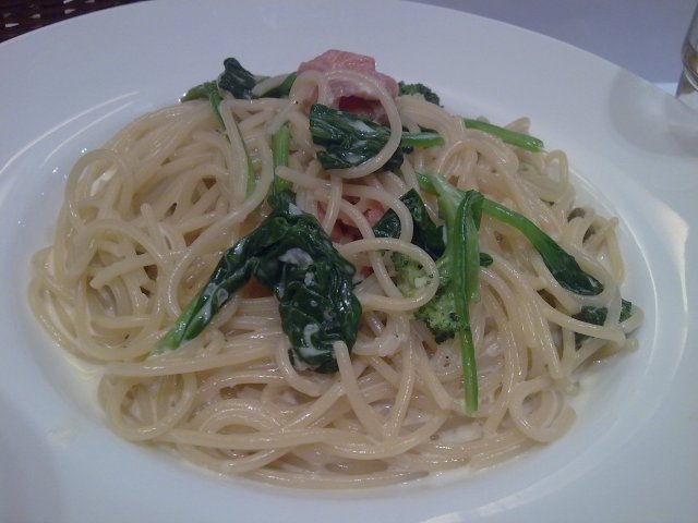 @柠檬三文鱼菠菜面,真没吃出来柠檬味,倒是有芝士味,但是还是必胜客的车打芝士面好吃~而且烧的有点硬,不过老板说今天特地烧的硬了点,怕软的我们不喜欢