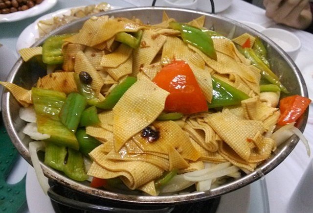 一般人都能接受豆皮的,这个菜分量一般,里面加入了豆皮,青椒和红椒。豆皮比较容易入味,做干锅也挺合适的,吃起来味道不错。只是有些油腻,而且过于咸了。