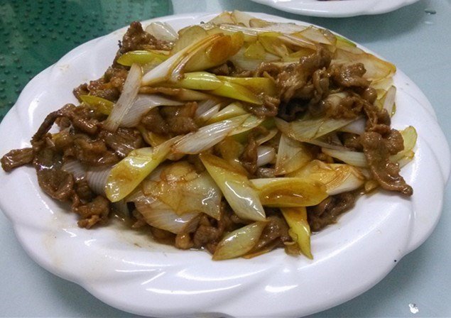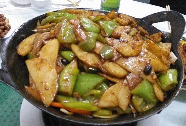 大部分人比较喜欢吃这道菜,土豆绵软入味,配上少许洋葱、青椒等,调节下味道,甚是不错。这个菜吃到最后容易糊锅底,尽量要快点儿吃。
