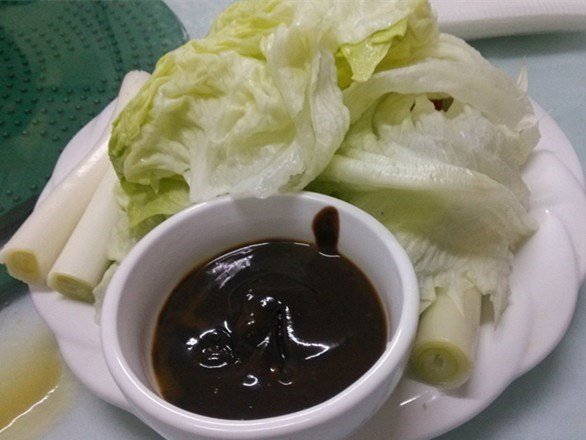 最简单的就是这道菜了,只需要把原材料切好了放盘里,然后蘸酱吃就行。我不大喜欢吃这个菜,感觉没什么好吃的,但是男生特别喜欢点这个。可能比较清口吧。