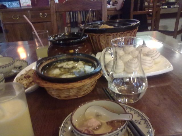首先是盐卤老豆腐,很简单的一个菜,可很入味,蟹籽干捞粉丝上真的有蟹籽的,橙色的蟹籽咬上去有沙沙的声音,真是有色有味野山菌煨土鸡有生精补气之功效,口感也不错,苔菜什果里有红皮花生、剥皮花生、青豆、腰果,味道很不一般,高梁酒是从一个大酒缸里打出来的,入口劲足,回味时有点甜。最后甜点是紫薯包,那时已酒足饭饱,浅尝后打包走了。