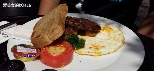 点击率很高的牛排套餐!量不小,一块牛排,一片烤吐司,一个煎蛋,一堆土豆块,一块番茄和两盒黄油。牛肉真心不错,牛肉味重而且很香,不知道是不是LG要了十分熟变成了牛肉干的缘故,所以这块牛排除了LG造成的“老”之外,分数还是可以给非常高的!吐司烤得刚刚好,够松软!考拉最爱土豆这种烧法了,混着培根洋葱煎炒,微焦咸咸的,好吃。
