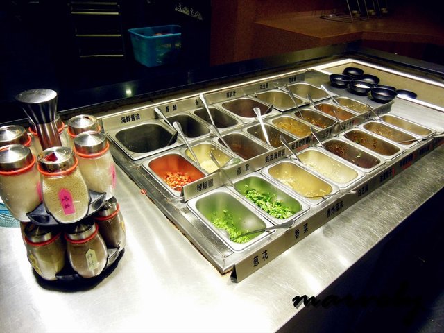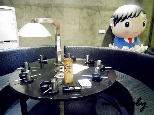 店里的装修,带着一丝丝的小格调,店面墙壁上画着一些美国动漫角色,感觉店主应该是和喜欢动漫的男生。店面是正方形的,从门口进去,分为左右两片,左边是提供给人数较少的客人的卡座,右边有三个比较大的圆形沙发座,像我们这家超过4个人,就可以做在这里围着做了。右边还僻处了一处地方专门放置各种蘸酱和调料。