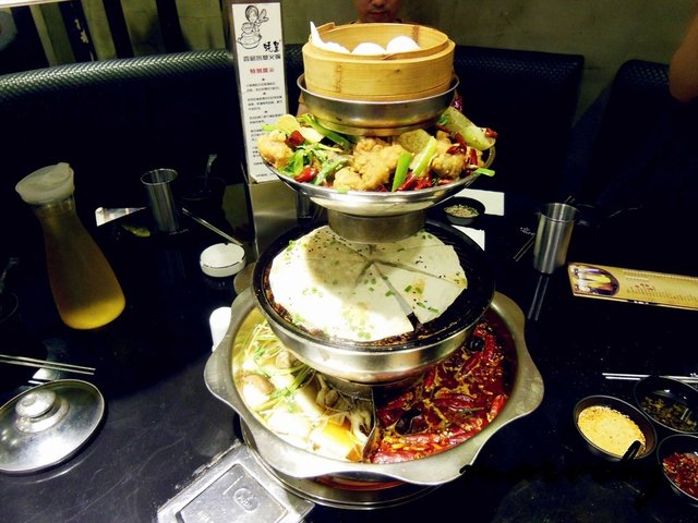 不多久,我们的火锅就端了上来,这种四层火锅,看起来还真的像是一个宝塔啊。火锅的最上层是蒸炉,我们点了蟹肉皇虾饺放在上面蒸,从上面数第二层是一般性的锅子,有加热和保温功能,我们在店员的建议下垫的是刚的是干锅牛蛙,第三层是烤炉,最下面一层自然是火锅了。