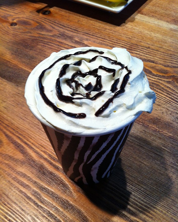 :)美味的摩卡,黑色巧克力酱陪着白色的奶油与斑马条纹的杯子似乎融为一体。