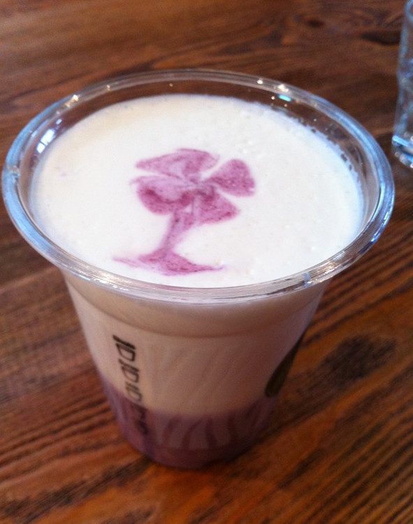:)我最喜欢的还是这杯紫薯拿铁,是一款无咖啡因的饮品。喜欢浓郁的紫薯和奶泡在唇边甜蜜的感觉。