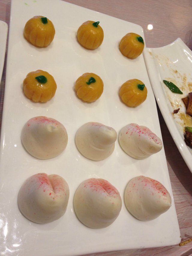 【南瓜包、寿桃】是我见过的最像屁股的寿桃,里面是豆沙馅的,软软甜甜的,南瓜包是糯米做的,里面包了奶黄一样的东西,甜掉牙啊。