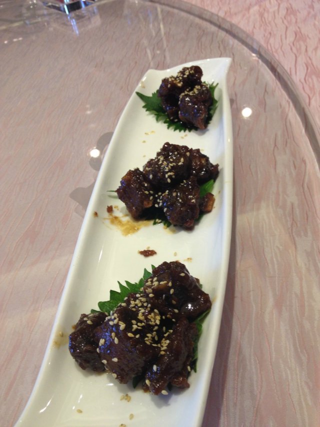 【烤乳猪】588元的烤乳猪,还差点被调换成烤猪肉,不过乳猪的卖相还是不错的,外面的酥皮烤得比较脆,让服务生拿去把骨头上的肉剔下来,没想到只有放茶杯的那种托盘的一点点,还说什么骨架不给的。>-<,拿回来之后发现上面全都是肉肉啊!