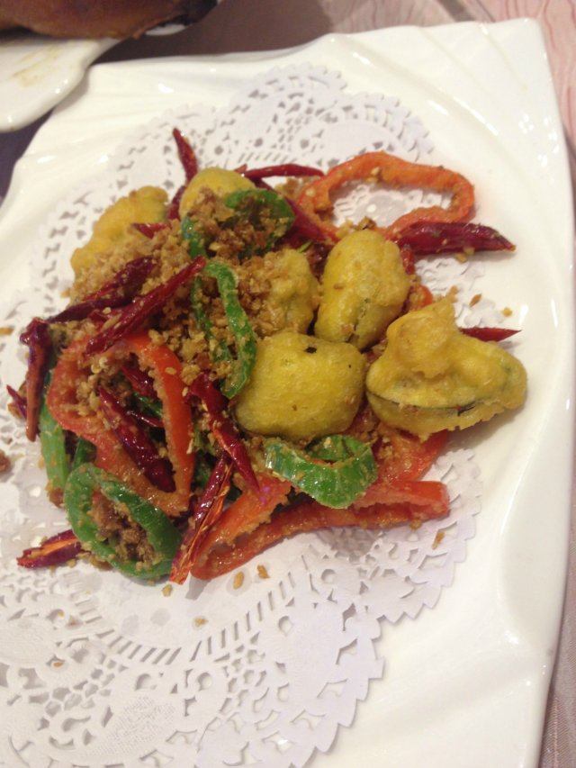 【炸茄盒】分量少的出奇啊,只有5,6只茄盒,恐怕2,3个人点这道菜也不够分吧!桌子转了一半不到,盘子里就只剩下面粉碎碎了,完全没尝到味道。