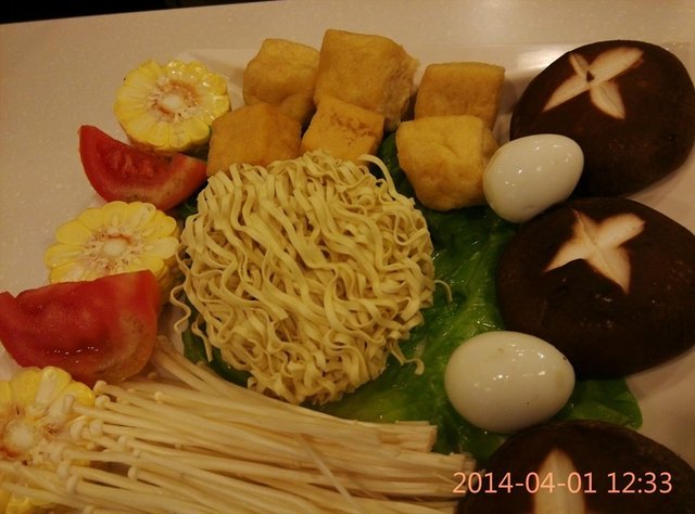 【什锦拼盘】:6种素菜,玉米、番茄、豆腐、鹌鹑蛋、香菇、火锅面。