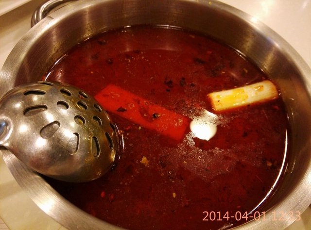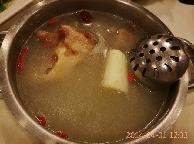 在吃了以上这么多香辣的菜品之后,我们点的大骨汤锅底也熬出了头,舀了两碗来喝,