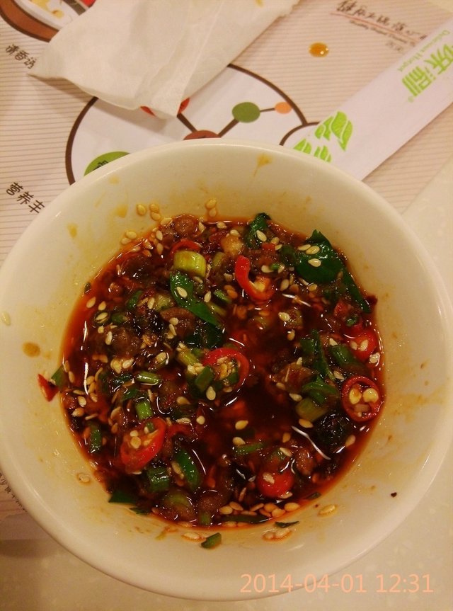 兑了一碗传统的调料,就是麻油、蒜泥、葱花、芝麻。