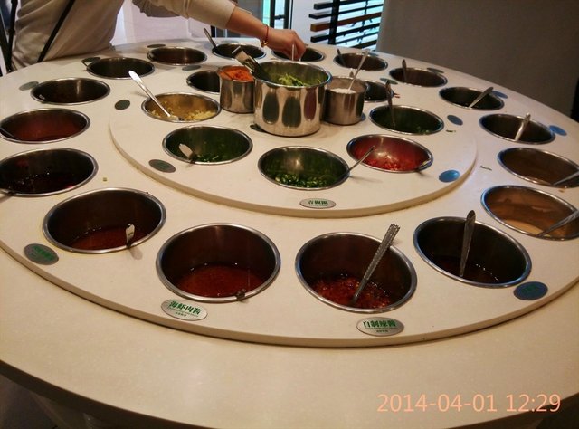 在选择好锅底和菜品后,就是自行兑调料,4元/人,价格说贵也不贵,说便宜也不便宜,