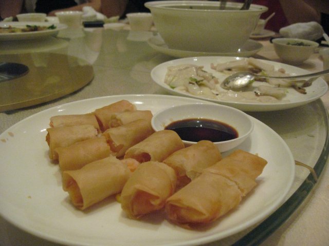 鲜虾春卷,货真价实啊,每个里头都是大大的虾仁啊,外层也炸得好脆啊,大油锅炸的,自己在家里估计很少能这样。
