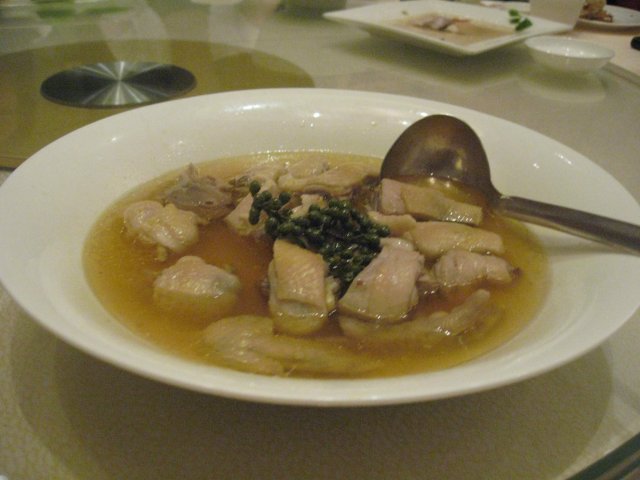 走地鸡,貌似现在流行这菜,鸡块浸在油晃晃的汤里,鲜是老鲜的,不过还是觉得量少啊,吃起不过瘾。鸡肉的肉质很鲜嫩,而且有种紧紧的口感,不是那种松垮垮的。