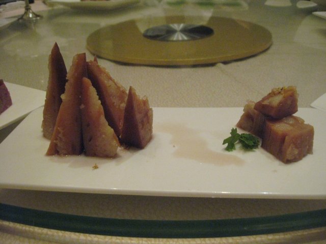糖藕,摆盘还拗了个造型,糯米黏黏的,蛮好吃的,也不会很甜,量也偏小,好像不够十个人一人分一块的。
