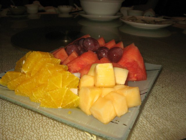 送了份水果盘,里头西瓜、提子、哈密瓜、橙子都有,造型也不错。