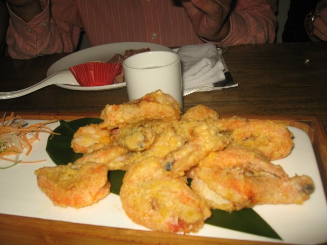 蛋黄炒虾,虾的个头挺大的,裹了咸蛋黄,放在油里炸,倒也蛮别致的,咸鲜的口味,很赞。