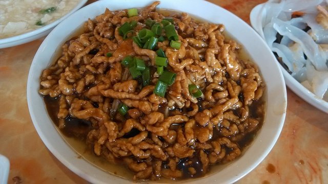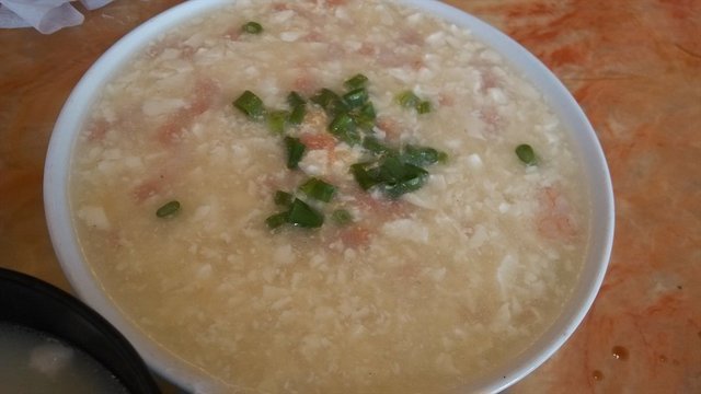 三鲜豆花,20元一份,成份主要是豆腐外加火腿外加极少量虾仁,粥的味道带着些鲜味,刚开始喝时感觉还不错,挺鲜美的,但喝多了感觉调料味的感觉越来越重,里面放了少量的淀粉,咸料放的不多,偏清淡口,不太适合下饭,最后剩了不少。