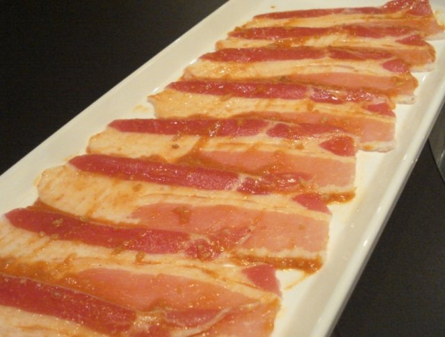 【辣味梅肉】——切的也很薄,而且吃上去嫩嫩的,口感不同于别的肉质,有些油但是可以吃的出肉质本身的香味,不过个人感觉没有【五花肉】来的喜欢,稍微油腻了一点,还算有蔬菜可以解油腻。
