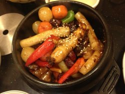 【炒年糕】还是喜欢这种米做的年糕,不会很粘牙,但是绝对的香糯,加上韩式辣酱炒,很经典的味道。里面有配胡萝卜和卷心菜,有蔬菜搭配,吃起来也觉得营养很均衡。