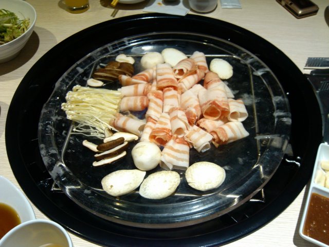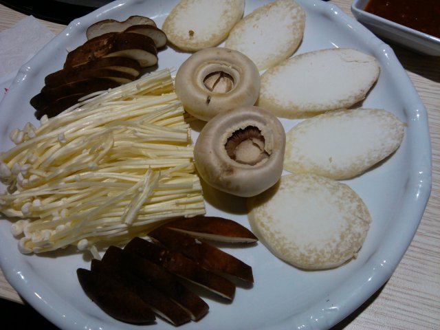 水晶烤盘就是让人看起来干净,下面的燃气打着就开始加热,加热的也比较均匀,不用怕烤焦了,很快肉就变了颜色,吱吱作响,不知道是不是饿了,第一盘就吃的这盘刨子猪五花肉,非常的好吃。肉烤好了放在盘边,大家蘸着小料开吃,看着有些略肥,但吃起来很嫩不腻,蘑菇没烤好直接放中间继续烤
