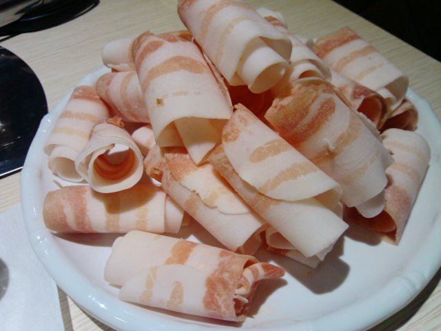 【刨子猪五花肉】看起来比较肥,个人感觉这肉吃起来很不错,稍肥但是不腻~~冰鲜切片的肉,颜色较淡一些。