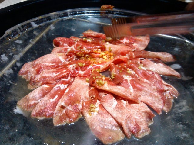 服务员不停的用夹子翻滚着肉片,八九分熟的时候,用大剪刀剪成小块,大家又开始猛吃,这个肉稍显肥了,而且不能长时间的烤,容易老。