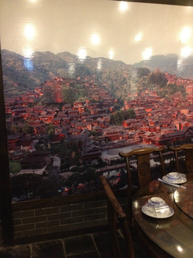 墙上一张巨大的凤凰民居的照片非常显眼,于是我提议就坐在这张照片旁边哈哈