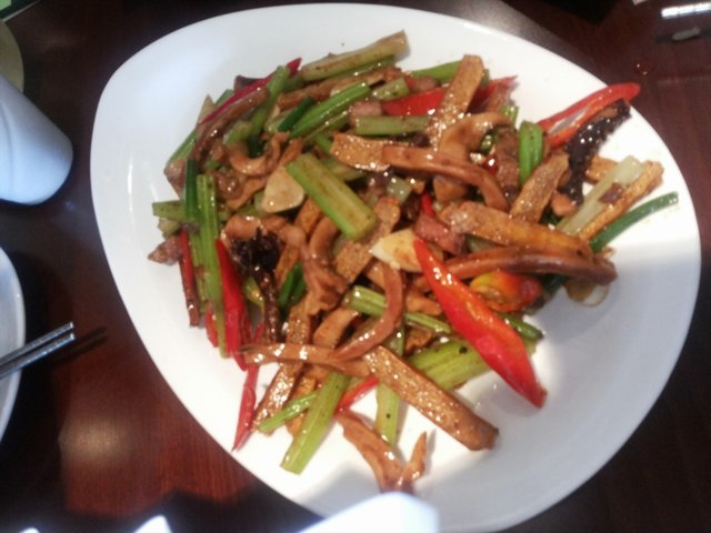 客家小炒38元,就像我们自己家做的小炒一样,芹菜 豆腐干 咸肉,不同的是这个客家小炒里的豆干过油了,所以吃起来比较脆,不怕胖的妹纸们可以尝试这种做法哦。