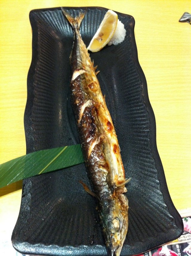 【烤秋刀鱼】:秋刀鱼淋上柠檬汁,酸酸的味道,去除了鱼的腥味,烤的外皮非常的香脆,肉质紧实,很有嚼劲,吃口还有那么一丝的清甜!