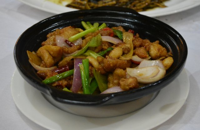 广味三杯鸡,做法比较独特,和台式三杯鸡相比,广式的是裹了一层面糊炸的,配料也比台式的丰富,有洋葱,青椒,彩椒,大蒜等等~ 味道还是不错的,肉的比例也足够。