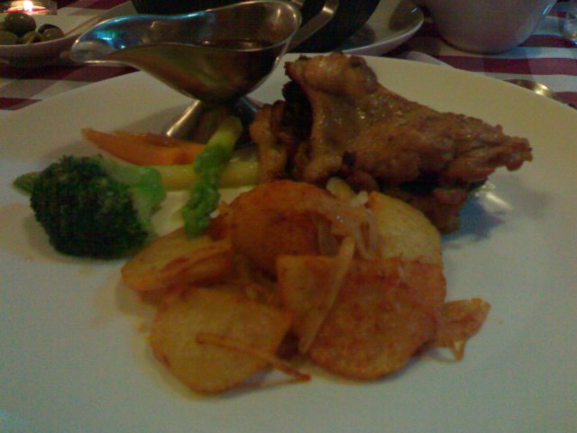roamed spring chicken(138):一整只鸡,上海宁叫草鸡,外地有的地方叫溜达鸡。。。(蛮形象的)肉蛮嫩的,肚子里面还放了梅肉,口感比较清新,鲜中带丝丝甜味。配菜是土豆片和一些胡萝卜,芦笋之类的。