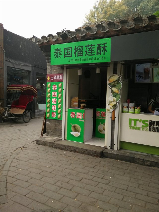 榴莲酥是种泰国的小吃,虽然没去过泰国,但是在北京很多地方都吃过,例如庙会和其他小吃店,这家小店逛锣鼓巷时候看到买过,在南锣鼓巷里面,具体在哪里不记得了,仔细找一下,反正在南锣鼓巷南口进入左手边。一个小门脸,绿色的,写的泰国榴莲酥,因为很喜欢吃榴莲,也喜欢吃榴莲酥,以前在庙会就经常买,所以这家店也不例外。小店老板态度还算不错,但是卫生一般吧。