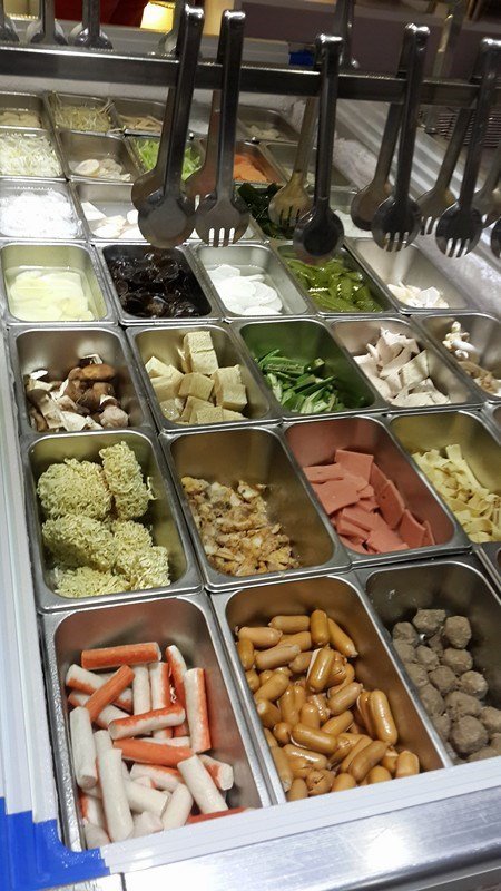 凉菜几款,连主食热菜(炒河粉)都有。饮料不同于其他自助餐厅,是独立包装的,而非饮料机自助,冰柜里摆好几种(雪碧、七喜、可乐、加多宝、芬达、矿泉水、雪花啤酒等),连鲜榨椰汁都有。涮品的种类可就多了,三个大冻柜,玲琅满目的呈现在你面前。冻柜一:海鲜类有脆皖鱼腩、脆皖鱼、鱿鱼、基围虾、小蟹、田鸡、多春鱼、黄骨鱼……我比较喜欢吃脆皖鱼腩,基围虾新鲜得活蹦乱跳,然后净拿小蟹盖吃。别看蟹下,盖里还是有些膏的,我吃了十几只。