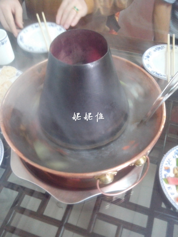 锅用的是老北京铜炉涮锅,烧碳,火很旺,可以要求服务员拿压火的东西。汤就是最一般的清汤锅,白水加一点枸杞、葱姜什么的,我们是为了吃肉,能体现羊肉本味的就好。